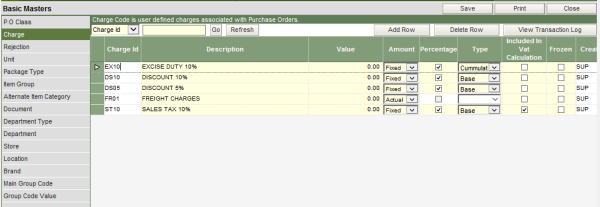 All charges, for example, sales tax, discounts, excise duty, freight charges, VAT etc. being applied at the time of raising a purchase order, needs to be configured in the system. The Charge master allows doing so.